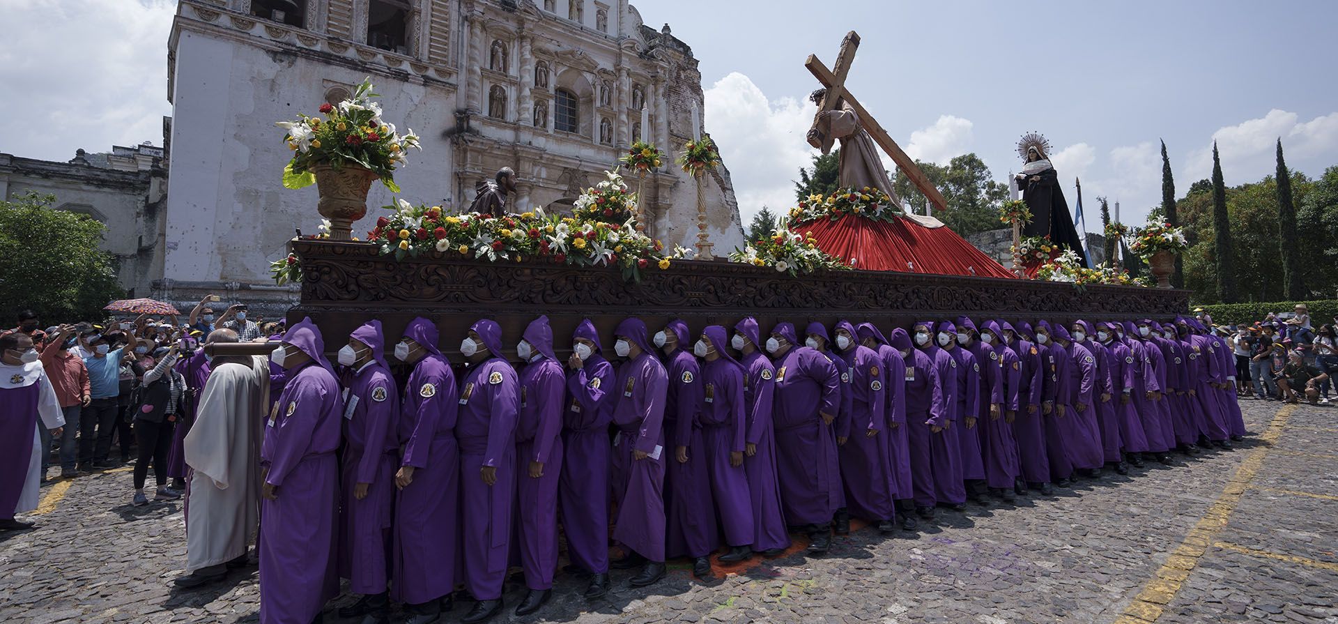 "Cucuruchos" llevan una estatua de Jesucristo en una carroza religiosa durante una procesión del Jueves Santo en la iglesia católica de San Francisco, en Antigua, Guatemala, el jueves 14 de abril de 2022. Procesiones y carrozas religiosas desfilan por las calles de todo el país durante Semana Santa, que conmemora la última semana de la vida terrena de Jesucristo culminando con su crucifixión el Viernes Santo y su resurrección el Domingo de Resurrección.