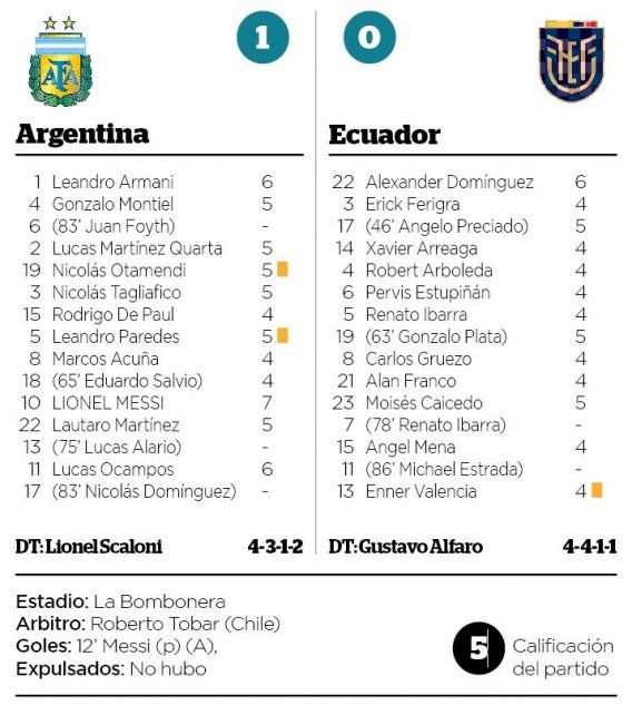 Si a los 5' el chileno Tobar hubiera marcado el claro penal que Arreaga le cometió a Lionel Messi (de hizo de la camiseta un chicle), el partido se hubiera empezado a resolver mucho tiempo antes. Es cierto, el penal que el árbitro cobró cinco minutos después quizá lo hubiera obviado, pero así se dieron las cosas en el arranque de Argentina-Ecuador, en el que el equipo de Lionel Scaloni, aun sin sobrarle demasiado, le sobró oficio para imponerse ante los temores extremos de parte de conjunto de Gustavo Alfaro. Una participación activa de Messi y correcto acompañamiento del resto le alcanzó a la Argentina para arrancar con el pie derecho las eliminatorias rumbo a Qatar 2022. Escueto y Apenas discreto 1 a 0.